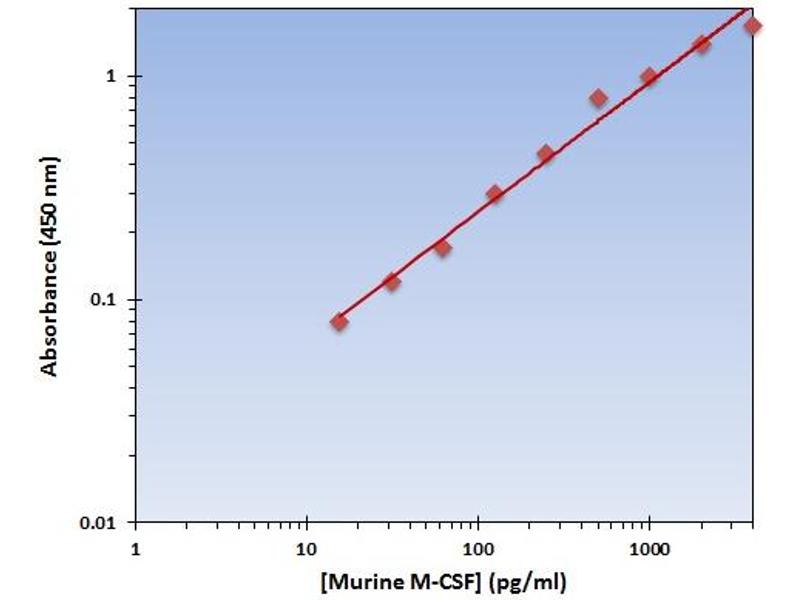 - The OmniKine? Murine M-CSF ELISA Kit contains the components necessary for quantitative determination of natural or recombinant Murine M-CSF concentrations within any experimental sample including cell lysates, serum and plasma. This particular immunoassay utilizes the quantitative technique of a "Sandwich" Enzyme-Linked Immunosorbent Assay (ELISA) where the target protein (antigen) is bound in a "sandwich" format by the primary capture antibodies coated to each well-bottom and the secondary detection antibodies added subsequently by the investigator. The capture antibodies coated to the bottom of each well are specific for a particular epitope on Murine M-CSF while the user-added detection antibodies bind to epitopes on the captured target protein. Amid each step of the procedure, a series of wash steps must be performed to ensure the elimination of non-specific binding between proteins to other proteins or to the solid phase. After incubation and "sandwiching" of the target antigen, a peroxidase enzyme is conjugated to the constant heavy chain of the secondary antibody (either covalently or via Avidin/Streptavidin-Biotin interactions), allowing for a colorimetric reaction to ensue upon substrate addition. When the substrate TMB (3, 3', 5, 5'-Tetramethylbenzidine) is added, the reaction catalyzed by peroxidase yields a blue color that is representative of the antigen concentration. Upon sufficient color development, the reaction can be terminated through addition of Stop Solution (2 N Sulfuric Acid) where the color of the solution will turn yellow. The absorbance of each well can then be read by a spectrophotometer, allowing for generation of a standard curve and subsequent determination of protein concentration.