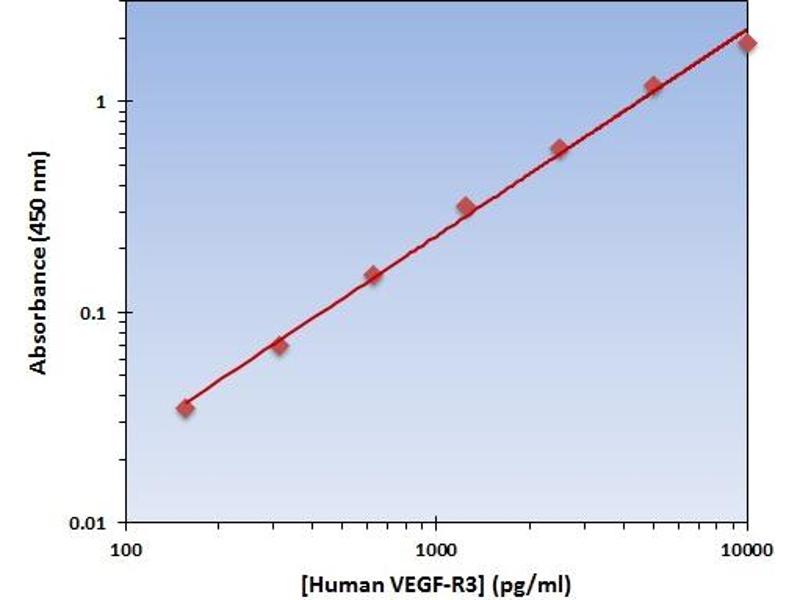 - This particular immunoassay utilizes the quantitative technique of a Sandwich Enzyme-Linked Immunosorbent Assay (ELISA) where the target protein (antigen) is bound in a sandwich format by the primary capture antibodies coated to each well-bottom and the secondary detection antibodies added subsequently by the investigator. The capture antibodies coated to the bottom of each well are specific for a particular epitope on the Human VEGF-R3 cytokine while the user-added detection antibodies bind to epitopes on the captured target protein. Amid each step of the procedure, a series of wash steps must be performed to ensure the elimination of non-specific binding between proteins to other proteins or to the solid phase. After incubation and sandwiching of the target antigen, a peroxidase enzyme is conjugated to the constant heavy chain of the secondary antibody (either covalently or via Avidin/Streptavidin-Biotin interactions), allowing for a colorimetric reaction to ensue upon substrate addition. When the substrate TMB (3, 3’, 5, 5’-Tetramethylbenzidine) is added, the reaction catalyzed by peroxidase yields a blue color that is representative of the antigen concentration. Upon sufficient color development, the reaction can be terminated through addition of Stop Solution (2 N Sulfuric Acid) where the color of the solution will turn yellow. The absorbance of each well can then be read by a spectrophotometer, allowing for generation of a standard curve and subsequent determination of protein concentration.