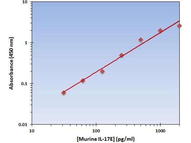 - This particular immunoassay utilizes the quantitative technique of a Sandwich Enzyme-Linked Immunosorbent Assay (ELISA) where the target protein (antigen) is bound in a sandwich format by the primary capture antibodies coated to each well-bottom and the secondary detection antibodies added subsequently by the investigator. The capture antibodies coated to the bottom of each well are specific for a particular epitope on the Murine IL-17E cytokine while the user-added detection antibodies bind to epitopes on the captured target protein. Amid each step of the procedure, a series of wash steps must be performed to ensure the elimination of non-specific binding between proteins to other proteins or to the solid phase. After incubation and sandwiching of the target antigen, a peroxidase enzyme is conjugated to the constant heavy chain of the secondary antibody (either covalently or via Avidin/Streptavidin-Biotin interactions), allowing for a colorimetric reaction to ensue upon substrate addition. When the substrate TMB (3, 3’, 5, 5’- Tetramethylbenzidine) is added, the reaction catalyzed by peroxidase yields a blue color that is representative of the antigen concentration. Upon sufficient color development, the reaction can be terminated through addition of Stop Solution (2 N Sulfuric Acid) where the color of the solution will turn yellow. The absorbance of each well can then be read by a spectrophotometer, allowing for generation of a standard curve and subsequent determination of protein concentration.