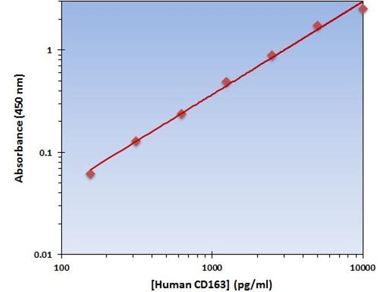 - The OmniKine? Human CD163 ELISA Kit contains the components necessary for quantitative determination of natural or recombinant Human CD163 concentrations within any experimental sample including cell lysates, serum and plasma. This particular immunoassay utilizes the quantitative technique of a "Sandwich" Enzyme-Linked Immunosorbent Assay (ELISA) where the target protein (antigen) is bound in a "sandwich" format by the primary capture antibodies coated to each well-bottom and the secondary detection antibodies added subsequently by the investigator. The capture antibodies coated to the bottom of each well are specific for a particular epitope on Human CD163 while the user-added detection antibodies bind to epitopes on the captured target protein. Amid each step of the procedure, a series of wash steps must be performed to ensure the elimination of non-specific binding between proteins to other proteins or to the solid phase. After incubation and "sandwiching" of the target antigen, a peroxidase enzyme is conjugated to the constant heavy chain of the secondary antibody (either covalently or via Avidin/Streptavidin-Biotin interactions), allowing for a colorimetric reaction to ensue upon substrate addition. When the substrate TMB (3, 3', 5, 5'-Tetramethylbenzidine) is added, the reaction catalyzed by peroxidase yields a blue color that is representative of the antigen concentration. Upon sufficient color development, the reaction can be terminated through addition of Stop Solution (2 N Sulfuric Acid) where the color of the solution will turn yellow. The absorbance of each well can then be read by a spectrophotometer, allowing for generation of a standard curve and subsequent determination of protein concentration.