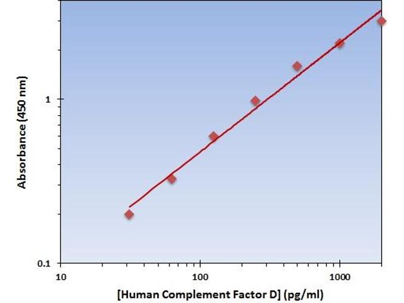 - The Human Complement Factor D ELISA Kit allows for the detection and quantification of endogenous levels of natural and/or recombinant Human Complement Factor D proteins within the range of 32-2000 pg/mL.