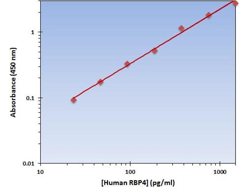 - The OmniKine? Human RBP4 ELISA Kit contains the components necessary for quantitative determination of natural or recombinant Human RBP4 concentrations within any experimental sample including cell lysates, serum and plasma. This particular immunoassay utilizes the quantitative technique of a "Sandwich" Enzyme-Linked Immunosorbent Assay (ELISA) where the target protein (antigen) is bound in a "sandwich" format by the primary capture antibodies coated to each well-bottom and the secondary detection antibodies added subsequently by the investigator. The capture antibodies coated to the bottom of each well are specific for a particular epitope on Human RBP4 while the user-added detection antibodies bind to epitopes on the captured target protein. Amid each step of the procedure, a series of wash steps must be performed to ensure the elimination of non- specific binding between proteins to other proteins or to the solid phase. After incubation and "sandwiching" of the target antigen, a peroxidase enzyme is conjugated to the constant heavy chain of the secondary antibody (either covalently or via Avidin/Streptavidin-Biotin interactions), allowing for a colorimetric reaction to ensue upon substrate addition. When the substrate TMB (3, 3', 5, 5'-Tetramethylbenzidine) is added, the reaction catalyzed by peroxidase yields a blue color that is representative of the antigen concentration. Upon sufficient color development, the reaction can be terminated through addition of Stop Solution (2 N Sulfuric Acid) where the color of the solution will turn yellow. The absorbance of each well can then be read by a spectrophotometer, allowing for generation of a standard curve and subsequent determination of protein concentration.