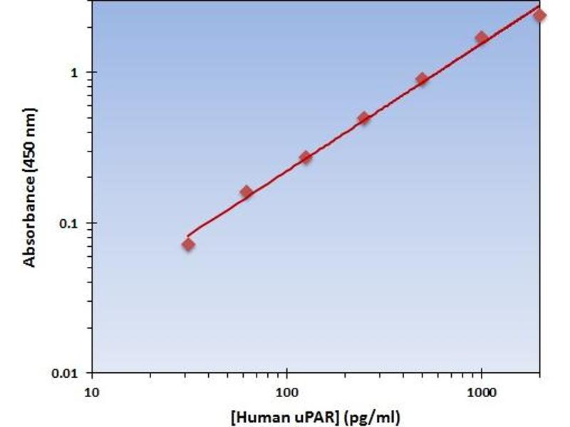 - The OmniKine? Human uPAR ELISA Kit contains the components necessary for quantitative determination of natural or recombinant Human uPAR concentrations within any experimental sample including cell lysates, serum and plasma. This particular immunoassay utilizes the quantitative technique of a "Sandwich" Enzyme-Linked Immunosorbent Assay (ELISA) where the target protein (antigen) is bound in a "sandwich" format by the primary capture antibodies coated to each well-bottom and the secondary detection antibodies added subsequently by the investigator. The capture antibodies coated to the bottom of each well are specific for a particular epitope on Human uPAR while the user-added detection antibodies bind to epitopes on the captured target protein. Amid each step of the procedure, a series of wash steps must be performed to ensure the elimination of non- specific binding between proteins to other proteins or to the solid phase. After incubation and "sandwiching" of the target antigen, a peroxidase enzyme is conjugated to the constant heavy chain of the secondary antibody (either covalently or via Avidin/Streptavidin-Biotin interactions), allowing for a colorimetric reaction to ensue upon substrate addition. When the substrate TMB (3, 3', 5, 5'-Tetramethylbenzidine) is added, the reaction catalyzed by peroxidase yields a blue color that is representative of the antigen concentration. Upon sufficient color development, the reaction can be terminated through addition of Stop Solution (2 N Sulfuric Acid) where the color of the solution will turn yellow. The absorbance of each well can then be read by a spectrophotometer, allowing for generation of a standard curve and subsequent determination of protein concentration.
