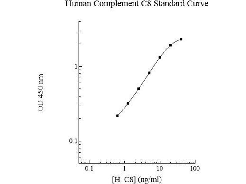 - The AssayMax Human Complement C8 ELISA kit is designed for detection of C8 in human plasma, serum, saliva, milk, and cell culture samples. This assay employs a quantitative sandwich enzyme immunoassay technique that measures C8 in less than 4 hours. A polyclonal antibody specific for C8 has been pre-coated onto a microplate. C8 in standards and samples is sandwiched by the immobilized antibody and a biotinylated polyclonal antibody specific for C8, which is recognized by a streptavidin-peroxidase conjugate. All unbound material is then washed away and a peroxidase enzyme substrate is added. The color development is stopped and the intensity of the color is measured.
