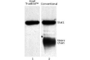 Goat IgG TrueBlot® is ideal for use in protocols involving immunoblotting of immunoprecipitated proteins. TrueBlot preferentially detects the non-reduced form of goat IgG over the reduced, SDS-denatured form of IgG. When the immunoprecipitate is fully reduced immediately prior to SDS-gel electrophoresis, reactivity of Goat IgG TrueBlot® with the 55 kDa heavy chains and the 23 kDa light chains of the immunoprecipitating antibody is minimized thereby eliminating interference by the heavy and light chains of the immunoprecipitating antibody in IP/Western blotting applications. Applications include studies examining post-translational modification (e.g., phosphorylation or acetylation) or protein-protein interactions. Goat IgG TrueBlot may also be used for detection in immunoblotting assays that do not employ immunoprecipitation.