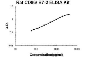 - rat CD86 ELISA Kit is based on standard sandwich enzyme-linked immune-sorbent assay technology. A monoclonal antibody from mouse specific for CD86 has been precoated onto 96-well plates. Standards(NSO, V29-I250) and test samples are added to the wells, a biotinylated detection polyclonal antibody from goat specific for CD86 is added subsequently and then followed by washing with PBS or TBS buffer. Avidin-Biotin-Peroxidase Complex is added and unbound conjugates are washed away with PBS or TBS buffer. HRP substrate TMB are used to visualize HRP enzymatic reaction. TMB is catalyzed by HRP to produce a blue color product that changed into yellow after adding acidic stop solution. The density of yellow is proportional to the rat CD86 amount of sample captured in plate.