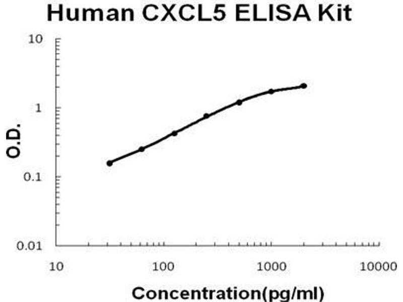 - human CXCL5 ELISA Kit was based on standard sandwich enzyme-linked immune-sorbent assay technology. A monoclonal antibody from mouse specific for CXCL5 has been precoated onto 96-well plates. Standards(E.coli, A37-N114) and test samples are added to the wells, a biotinylated detection polyclonal antibody from goat specific for CXCL5 is added subsequently and then followed by washing with PBS or TBS buffer. Avidin-Biotin-Peroxidase Complex was added and unbound conjugates were washed away with PBS or TBS buffer. HRP substrate TMB was used to visualize HRP enzymatic reaction. TMB was catalyzed by HRP to produce a blue color product that changed into yellow after adding acidic stop solution. The density of yellow is proportional to the human CXCL5 amount of sample captured in plate.