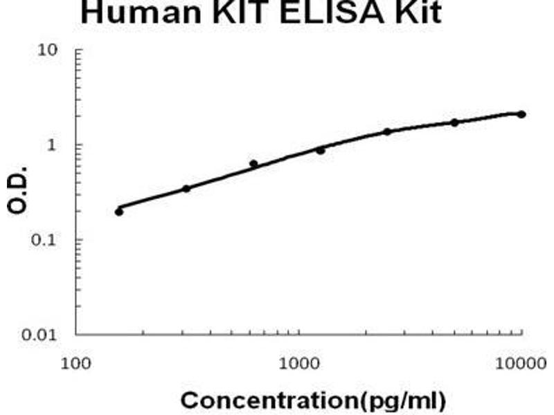 - human KIT ELISA Kit was based on standard sandwich enzyme-linked immune-sorbent assay technology. A monoclonal antibody from mouse specific for KIT has been precoated onto 96-well plates. Standards(sf21, Q26-T520) and test samples are added to the wells, a biotinylated detection polyclonal antibody from goat specific for KIT is added subsequently and then followed by washing with PBS or TBS buffer. Avidin-Biotin-Peroxidase Complex was added and unbound conjugates were washed away with PBS or TBS buffer. HRP substrate TMB was used to visualize HRP enzymatic reaction. TMB was catalyzed by HRP to produce a blue color product that changed into yellow after adding acidic stop solution. The density of yellow is proportional to the human KIT amount of sample captured in plate.
