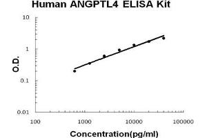 - human ANGPTL4 ELISA Kit was based on standard sandwich enzyme-linked immune-sorbent assay technology. A monoclonal antibody from mouse specific for ANGPTL4 has been precoated onto 96-well plates. Standards(NSO, L165-S406) and test samples are added to the wells, a biotinylated detection polyclonal antibody from goat specific for ANGPTL4 is added subsequently and then followed by washing with PBS or TBS buffer. Avidin-Biotin-Peroxidase Complex was added and unbound conjugates were washed away with PBS or TBS buffer. HRP substrate TMB was used to visualize HRP enzymatic reaction. TMB was catalyzed by HRP to produce a blue color product that changed into yellow after adding acidic stop solution. The density of yellow is proportional to the human ANGPTL4 amount of sample captured in plate.