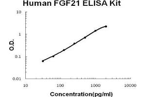 - human FGF21 ELISA Kit was based on standard sandwich enzyme-linked immune-sorbent assay technology. A monoclonal antibody from mouse specific for FGF21 has been precoated onto 96-well plates. Standards(E.coli, H29-S209) and test samples are added to the wells, a biotinylated detection polyclonal antibody from goat specific for FGF21 is added subsequently and then followed by washing with PBS or TBS buffer. Avidin-Biotin-Peroxidase Complex was added and unbound conjugates were washed away with PBS or TBS buffer. HRP substrate TMB was used to visualize HRP enzymatic reaction. TMB was catalyzed by HRP to produce a blue color product that changed into yellow after adding acidic stop solution. The density of yellow is proportional to the human FGF21 amount of sample captured in plate.