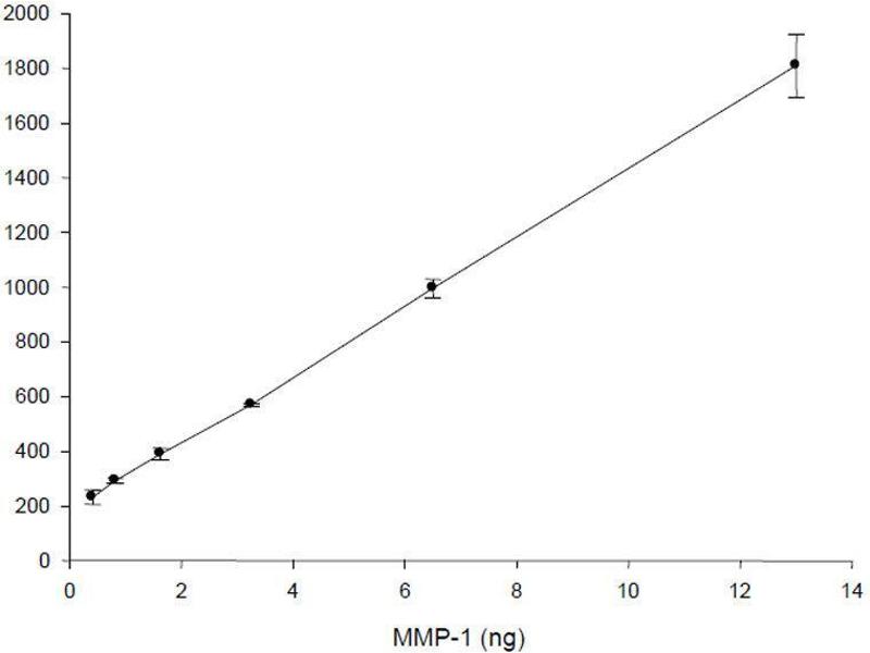 - SensoLyte® 520 MMP-1 Assay Kit uses a 5-FAM (fluorophore) and QXL520™ (quencher) labeled FRET peptide substrate for continuous measurement of enzyme activity. In an intact FRET peptide, the fluorescence of 5-FAM is quenched by QXL520™. Upon the cleavage of the FRET peptide by MMP-1, the fluorescence of 5-FAM is recovered, and can be continuously monitored at excitation/emission = 490 nm/520 nm. With superior fluorescence quantum yield and longer emission wavelength, 5-FAM/QXL520™ based FRET peptide has less interference from the autofluorescence of test compounds and cellular components and provides better assay sensitivity. The assays are performed in a convenient 96-well or 384-well microplate format.
