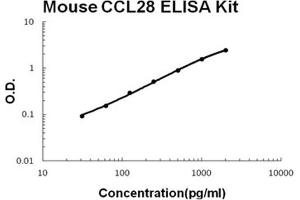 - mouse CCL28 ELISA Kit was based on standard sandwich enzyme-linked immune-sorbent assay technology. A monoclonal antibody from rat specific for CCL28 has been precoated onto 96-well plates. Standards(E.coli, I23-R130) and test samples are added to the wells, a biotinylated detection polyclonal antibody from goat specific for CCL28 is added subsequently and then followed by washing with PBS or TBS buffer. Avidin-Biotin-Peroxidase Complex was added and unbound conjugates were washed away with PBS or TBS buffer. HRP substrate TMB was used to visualize HRP enzymatic reaction. TMB was catalyzed by HRP to produce a blue color product that changed into yellow after adding acidic stop solution. The density of yellow is proportional to the mouse CCL28 amount of sample captured in plate.