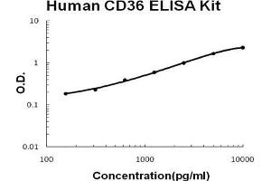 - human CD36 ELISA Kit was based on standard sandwich enzyme-linked immune-sorbent assay technology. A monoclonal antibody from mouse specific for CD36 has been precoated onto 96-well plates. Standards(sf21, G30-N439) and test samples are added to the wells, a biotinylated detection polyclonal antibody from goat specific for CD36 is added subsequently and then followed by washing with PBS or TBS buffer. Avidin-Biotin-Peroxidase Complex was added and unbound conjugates were washed away with PBS or TBS buffer. HRP substrate TMB was used to visualize HRP enzymatic reaction. TMB was catalyzed by HRP to produce a blue color product that changed into yellow after adding acidic stop solution. The density of yellow is proportional to the human CD36 amount of sample captured in plate.
