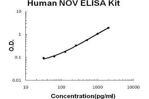 - human NOV ELISA Kit was based on standard sandwich enzyme-linked immune-sorbent assay technology. A monoclonal antibody from mouse specific for NOV has been precoated onto 96-well plates. Standards(NSO, T32-M357) and test samples are added to the wells, a biotinylated detection polyclonal antibody from goat specific for NOV is added subsequently and then followed by washing with PBS or TBS buffer. Avidin-Biotin-Peroxidase Complex was added and unbound conjugates were washed away with PBS or TBS buffer. HRP substrate TMB was used to visualize HRP enzymatic reaction. TMB was catalyzed by HRP to produce a blue color product that changed into yellow after adding acidic stop solution. The density of yellow is proportional to the human NOV amount of sample captured in plate.