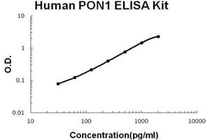 - human PON1 ELISA Kit was based on standard sandwich enzyme-linked immune-sorbent assay technology. A monoclonal antibody from mouse specific for PON1 has been precoated onto 96-well plates. Standards(NSO, A2-L355) and test samples are added to the wells, a biotinylated detection polyclonal antibody from goat specific for PON1 is added subsequently and then followed by washing with PBS or TBS buffer. Avidin-Biotin-Peroxidase Complex was added and unbound conjugates were washed away with PBS or TBS buffer. HRP substrate TMB was used to visualize HRP enzymatic reaction. TMB was catalyzed by HRP to produce a blue color product that changed into yellow after adding acidic stop solution. The density of yellow is proportional to the human PON1 amount of sample captured in plate.