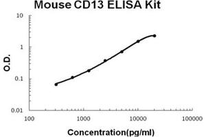 - mouse CD13 ELISA Kit was based on standard sandwich enzyme-linked immune-sorbent assay technology. A monoclonal antibody from rat specific for CD13 has been precoated onto 96-well plates. Standards(NSO, K69-S966) and test samples are added to the wells, a biotinylated detection polyclonal antibody from goat specific for CD13 is added subsequently and then followed by washing with PBS or TBS buffer. Avidin-Biotin-Peroxidase Complex was added and unbound conjugates were washed away with PBS or TBS buffer. HRP substrate TMB was used to visualize HRP enzymatic reaction. TMB was catalyzed by HRP to produce a blue color product that changed into yellow after adding acidic stop solution. The density of yellow is proportional to the mouse CD13 amount of sample captured in plate.