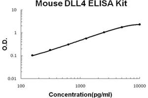 - mouse DLL4 ELISA Kit was based on standard sandwich enzyme-linked immune-sorbent assay technology. A monoclonal antibody from rat specific for DLL4 has been precoated onto 96-well plates. Standards(NSO, S28-P525) and test samples are added to the wells, a biotinylated detection polyclonal antibody from goat specific for DLL4 is added subsequently and then followed by washing with PBS or TBS buffer. Avidin-Biotin-Peroxidase Complex was added and unbound conjugates were washed away with PBS or TBS buffer. HRP substrate TMB was used to visualize HRP enzymatic reaction. TMB was catalyzed by HRP to produce a blue color product that changed into yellow after adding acidic stop solution. The density of yellow is proportional to the mouse DLL4 amount of sample captured in plate.