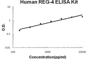 - human REG-4 ELISA Kit was based on standard sandwich enzyme-linked immune-sorbent assay technology. A monoclonal antibody from mouse specific for REG-4 has been precoated onto 96-well plates. Standards(E.coli, D23-P158) and test samples are added to the wells, a biotinylated detection polyclonal antibody from goat specific for REG-4 is added subsequently and then followed by washing with PBS or TBS buffer. Avidin-Biotin-Peroxidase Complex was added and unbound conjugates were washed away with PBS or TBS buffer. HRP substrate TMB was used to visualize HRP enzymatic reaction. TMB was catalyzed by HRP to produce a blue color product that changed into yellow after adding acidic stop solution. The density of yellow is proportional to the human REG-4 amount of sample captured in plate.
