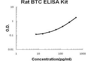 - rat BTC ELISA Kit was based on standard sandwich enzyme-linked immune-sorbent assay technology. A monoclonal antibody from mouse specific for BTC has been precoated onto 96-well plates. Standards(E.coli, D32-Y111) and test samples are added to the wells, a biotinylated detection polyclonal antibody from goat specific for BTC is added subsequently and then followed by washing with PBS or TBS buffer. Avidin-Biotin-Peroxidase Complex was added and unbound conjugates were washed away with PBS or TBS buffer. HRP substrate TMB was used to visualize HRP enzymatic reaction. TMB was catalyzed by HRP to produce a blue color product that changed into yellow after adding acidic stop solution. The density of yellow is proportional to the rat BTC amount of sample captured in plate.