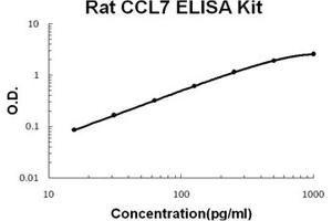 - rat CCL7 ELISA Kit was based on standard sandwich enzyme-linked immune-sorbent assay technology. A monoclonal antibody from mouse specific for CCL7 has been precoated onto 96-well plates. Standards(E.coli, Q24-P97) and test samples are added to the wells, a biotinylated detection polyclonal antibody from goat specific for CCL7 is added subsequently and then followed by washing with PBS or TBS buffer. Avidin-Biotin-Peroxidase Complex was added and unbound conjugates were washed away with PBS or TBS buffer. HRP substrate TMB was used to visualize HRP enzymatic reaction. TMB was catalyzed by HRP to produce a blue color product that changed into yellow after adding acidic stop solution. The density of yellow is proportional to the rat CCL7 amount of sample captured in plate.
