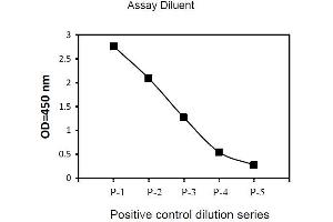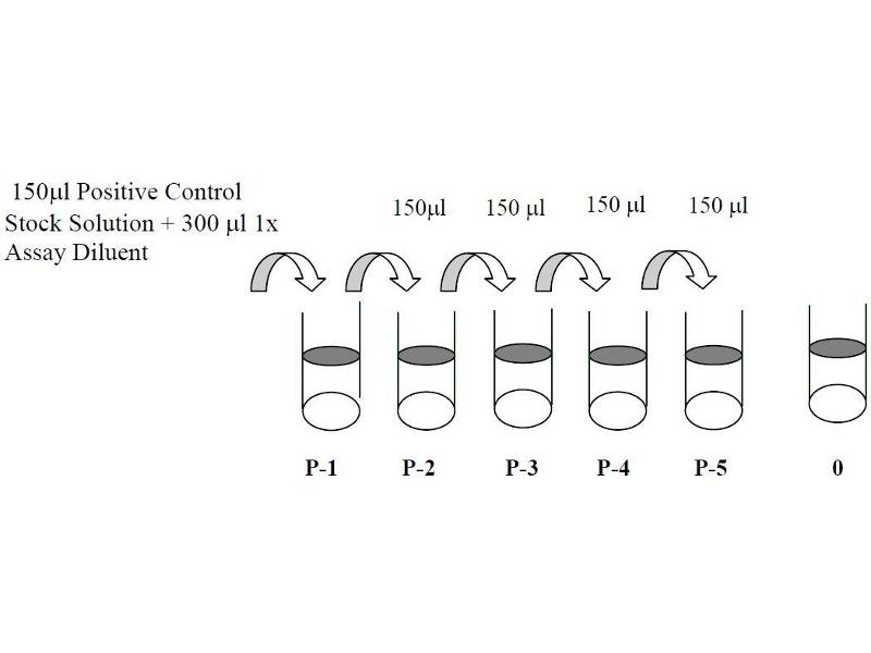 3. Preparation of Positive Control: Briefly spin the Positive Control vial of Item K. Add 250 µL 1x Assay Diluent (Item E, Assay Diluent should be diluted 5-fold with deionized or distilled water before use) into Item K vial to prepare a Positive Control Stock Solution. Dissolve the powder thoroughly by a gentle mix. Add 150 µL prepared Positive Control Stock Solution from the vial of Item K, into a tube with 300 µL 1x Assay Diluent to prepare P-1 (See i. Positive control of part IX.for a typical result). Pipette 300 µL 1x Assay Diluent into each tube. Transfer 150 µL prepared P-1 into a tube with 300 µL 1x Asaay Diluent to produce a dilution series (shown below). Mix each tube thoroughly before the next transfer. 1x Assay Diluent serves as the background. Phospho-TYK2 ELISA 6
