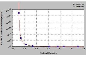 Create a standard curve by reducing the data using computer software capable of generating a four parameter logistic (4-PL) curve fit. As an alternative, construct a standard curve by plotting the mean absorbance for each standard on the x-axis against the concentration on the y-axis and draw a best fit curve through the points on the graph. The data may be linearized by plotting the log of the target antigen concentration versus the log of the O.D. and the best fit line can be determined by regression analysis. This procedure will produce an adequate but less precise fit of the data.