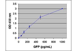 - GFP ELISA Kit is an enzyme immunoassay developed for detection and quantitation of GFP or GFP fusion protein in cell or tissue samples. The quantity of GFP or its variants (including BFP, CFP and YFP) in an unknown sample is determined by comparing its absorbance with that of a known recombinant GFP standard curve. The kit has detection sensitivity limit of 30 pg/mL GFP. The kit also provides an efficient system for rapid quantitation of GFP lentivirus titer for both viral supernatant and purified virus. Each kit provides sufficient reagents to perform up to 96 assays including standard curve and GFP samples.