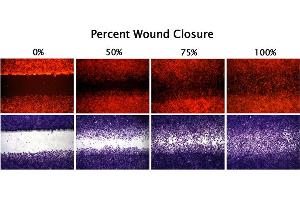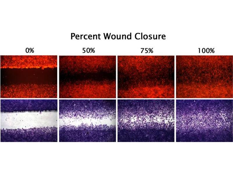 - Monitor the wound closure with a light microscope or imaging software. Measure the percent closure or the migration rate of the cells into the wound field. Wound healing results can be visualized with phase contrast, DAPI fluorescence labeling, or cell staining.