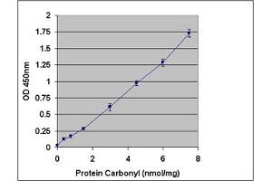 OxiSelect™ Protein Carbonyl ELISA Kit, protein samples are first allowed to adsorb to wells of a 96-well plate and then react with DNPH. There is no need to concentrate protein in experimental and clinical samples with low amounts of protein (< 4 mg/mL) and the kit requires protein sample as little as 10 μg/mL. The OxiSelect™ Protein Carbonyl ELISA Kit is an enzyme immunoassay developed for rapid detection and quantitation of protein carbonyls. The quantity of protein carbonyls in protein sample is determined by comparing its absorbance with that of a known reduced/oxidized BSA standard curve. Each kit provides sufficient reagents to perform up to 96 assays, including standard curve and unknown protein samples.