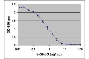 - The unknown 8-OHdG samples or 8-OHdG standards are first added to an 8-OHdG/BSA conjugate preabsorbed microplate. After a brief incubation, an anti-8-OHdG monoclonal antibody is added, followed by an HRP conjugated secondary antibody. The 8-OHdG content in unknown samples is determined by comparison with predetermined 8-OHdG standard curve.