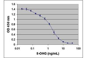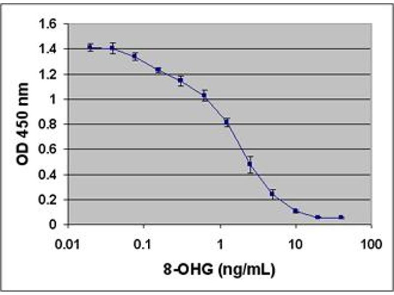 - The unknown 8-OHG samples or 8-OHG standards are first added to an 8-OHG/BSA conjugate preabsorbed EIA plate. After a brief incubation, an anti-8-OHG monoclonal antibody is added, followed by an HRP conjugated secondary antibody. The 8-OHG content in unknown samples is determined by comparison with predetermined 8-OHG standard curve.
