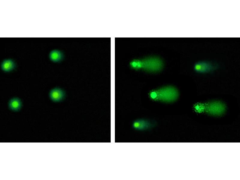 - First, individual cells are mixed with molten agarose before application to the OxiSelect™ Comet Slide. These embedded cells are then treated with a lysis buffer and alkaline solution, which relaxes and denatures the DNA. Finally, the samples are electrophoresed in a horizontal chamber to separate intact DNA from damaged fragments. Following electrophoresis, the samples are dried, stained with a DNA dye, and visualized by epifluorescence microscopy. Under these conditions, the damaged DNA (containing cleavage and strand breaks) will migrate further than intact DNA and produce a "comet tail" shape (see . Each kit provides sufficient reagents to perform up to 15 assays.