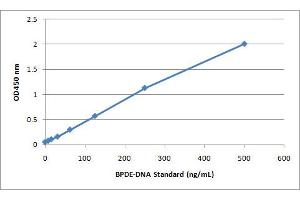 - BPDE-DNA standards or unknown DNA samples are adsorbed onto a 96-well DNA high-binding plate. The BPDE-DNA adducts present in the sample or standard are probed with an Anti-BPDE-I Antibody, followed by an HRP Conjugated Secondary Antibody. The BPDE-DNA adduct content in an unknown sample is determined by comparing with a standard curve that is prepared from predetermined BPDE-DNA standards.