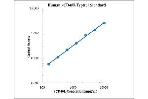 Average the duplicate optical density readings for each standards and sample, then subtract the average optical density value of the zero standard. Standard Concentration as horizontal axis, optical density (OD) Value as the vertical axis, regressing the data and create a standard curve using computer software. The data may be linearized by plotting the log of the sCD40L concentrations versus the log of the OD and the best fit line can be determined by regression analysis. This procedure will produce an adequate but less precise fit of the data. Note: The finally concentration of top standard is 10000 pg/mL. If instruction in this protocol have been followed samples have been diluted by 1:1 ratio (50 μL sample + 50 μL Assay Buffer), the concentration read from the standard curve must be multiplied by the dilution factor (x2). If samples have been diluted, the concentration read from the standard curve must be multiplied by the dilution factor.