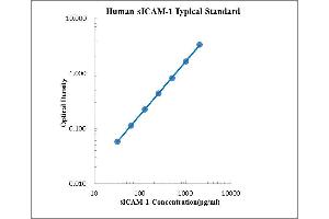 Average the duplicate optical density readings for each standards and sample, then subtract the average optical density value of the zero standard. Standard Concentration as horizontal axis, optical density (OD) Value as the vertical axis, regressing the data and create a standard curve using computer software. The data may be linearized by plotting the log of the sICAM-1 concentrations versus the log of the OD and the best fit line can be determined by regression analysis. This procedure will produce an adequate but less precise fit of the data. Note: The finally concentration of top standard is 2000 pg/mL. If instruction in this protocol have been followed samples have been diluted by 1:1 ratio (50 μL sample + 50 μL Assay Buffer), the concentration read from the standard curve must be multiplied by the dilution factor (x2). If serum/plasma samples have been diluted following the instruction, the final dilution factor is 200.