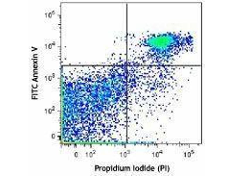 - FITC Annexin V Apoptosis Detection Kit with PI has been specifically designed for the identification of apoptotic and necrotic cells. Annexin V (or Annexin A5) is a member of the annexin family of intracellular proteins that binds to phosphatidylserine (PS) in a calcium-dependent manner. PS is normally only found on the intracellular leaflet of the plasma membrane in healthy cells, but during early apoptosis, membrane asymmetry is lost and PS translocates to the external leaflet. Fluorochrome-labeled Annexin V can then be used to specifically target and identify apoptotic cells. Annexin V Binding Buffer is recommended for use with Annexin V staining. Annexin V binding alone cannot differentiate between apoptotic and necrotic cells. To help distinguish between the necrotic and apoptotic cells we recommend use of our Propidium Iodide Solution (PI). Early apoptotic cells will exclude PI, while late stage apoptotic cells and necrotic cells will stain positively, due to the passage of these dyes into the nucleus where they bind to DNA. Propidium iodide is a fluorescent dye that binds to DNA. When excited by 488 nm laser light, it can be detected with in the PE/Texas Red® channel with a bandpass filter 610/10. It is commonly used in evaluation of cell viability or DNA content in cell cycle analysis by flow cytometry.