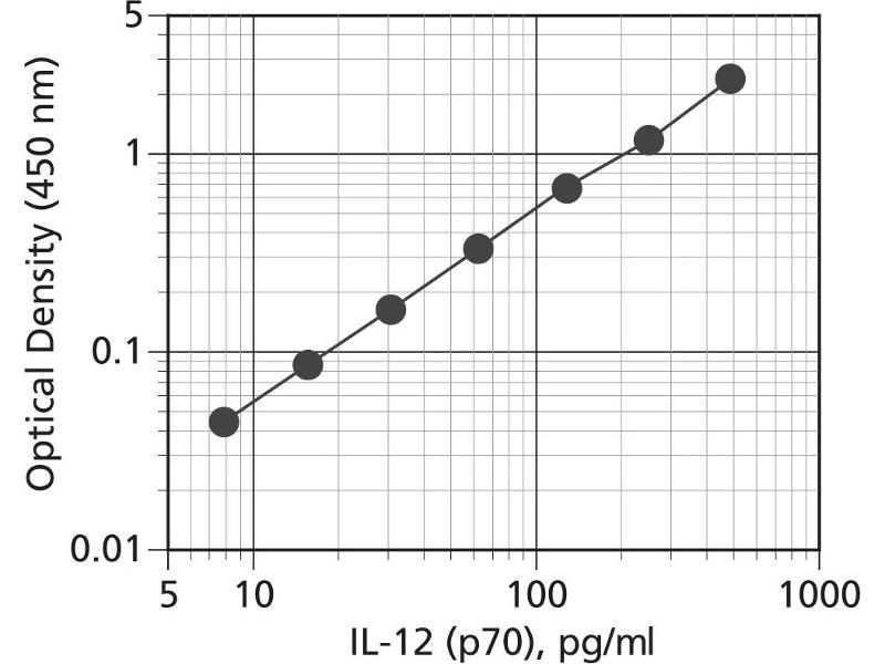 Human Interleukin-12 (p70) (hIL-12), also known as natural killer cell stimulatory factor (NKSF) or cytotoxic lymphocyte maturation factor (CLMF), is a potent regulator of cell-mediated immune responses. Biologically active IL-12 is secreted by activated B lymphocytes and macrophages as a 70 kD heterodimeric glycoprotein composed of disulfide-bonded 35 kD (p35) and 40 kD (p40) subunits. The BD OptEIA™ kit specifically measures only this biologically active p70.