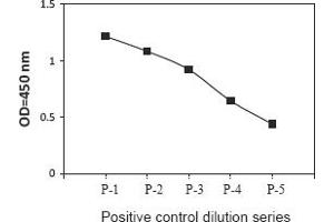 Prepare all reagents and samples as instructed in the manual.Add 100 μL of sample or positive control to each well.Incubate 2.5 h at RT or O/N at 4 °C.Add 100 μL of prepared primary antibody to each well.Incubate 1 h at RT.Add 100 μL of prepared 1X HRP-Streptavidin to each well.Incubate 1 h at RT.Add 100 μL of TMB One-Step Substrate Reagent to each well.Incubate 30 min at RT.Add 50 μL of Stop Solution to each well.Read at 450 nm immediately.