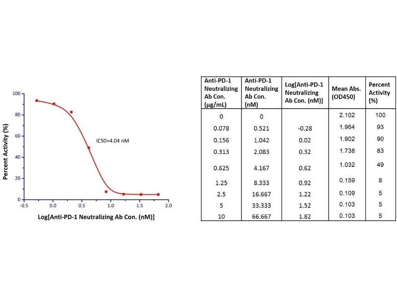 Serial dilutions of anti-PD-1 neutralizing antibody (1:2 serial dilutions, from 10 μg/mL to 0.078 μg/mL) was added into PD-L1 : PD-1-Biotin binding reactions. The assay was performed according to the above described protocol. Background was subtracted from data points prior to log transformation and curve fitting.