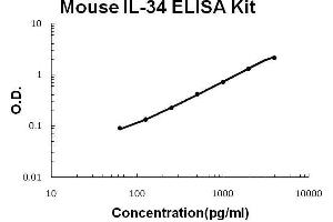 - mouse IL-34 ELISA Kit was based on standard sandwich enzyme-linked immune-sorbent assay technology. A monoclonal antibody from rat specific for IL-34 has been precoated onto 96-well plates. Standards(E.coli, N21-P235) and test samples are added to the wells, a biotinylated detection polyclonal antibody from goat specific for IL-34 is added subsequently and then followed by washing with PBS or TBS buffer. Avidin-Biotin-Peroxidase Complex was added and unbound conjugates were washed away with PBS or TBS buffer. HRP substrate TMB was used to visualize HRP enzymatic reaction. TMB was catalyzed by HRP to produce a blue color product that changed into yellow after adding acidic stop solution. The density of yellow is proportional to the mouse IL-34 amount of sample captured in plate.