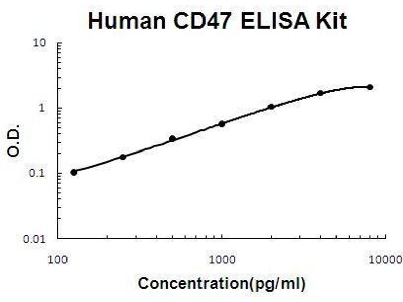 - human CD47 ELISA Kit was based on standard sandwich enzyme-linked immune-sorbent assay technology. A monoclonal antibody from mouse specific for CD47 has been precoated onto 96-well plates. Standards (NSO, Q19 - P139) and test samples are added to the wells, a biotinylated detection polyclonal antibody from goat specific for CD47 is added subsequently and then followed by washing with PBS or TBS buffer. Avidin-Biotin-Peroxidase Complex was added and unbound conjugates were washed away with PBS or TBS buffer. HRP substrate TMB was used to visualize HRP enzymatic reaction. TMB was catalyzed by HRP to produce a blue color product that changed into yellow after adding acidic stop solution. The density of yellow is proportional to the human CD47 amount of sample captured in plate.