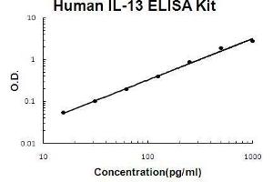 - human IL-13 ELISA Kit was based on standard sandwich enzyme-linked immune-sorbent assay technology. A monoclonal antibody from mouse specific for IL-13 has been precoated onto 96-well plates. Standards(E.coli, G21-N132) and test samples are added to the wells, a biotinylated detection polyclonal antibody from goat specific for IL-13 is added subsequently and then followed by washing with PBS or TBS buffer. Avidin-Biotin-Peroxidase Complex was added and unbound conjugates were washed away with PBS or TBS buffer. HRP substrate TMB was used to visualize HRP enzymatic reaction. TMB was catalyzed by HRP to produce a blue color product that changed into yellow after adding acidic stop solution. The density of yellow is proportional to the human IL-13 amount of sample captured in plate.