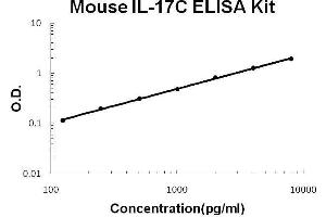 - mouse IL-17C ELISA Kit was based on standard sandwich enzyme-linked immune-sorbent assay technology. A monoclonal antibody from rat specific for IL-17C has been precoated onto 96-well plates. Standards(E.coli, D17-Q194) and test samples are added to the wells, a biotinylated detection polyclonal antibody from goat specific for IL-17C is added subsequently and then followed by washing with PBS or TBS buffer. Avidin-Biotin-Peroxidase Complex was added and unbound conjugates were washed away with PBS or TBS buffer. HRP substrate TMB was used to visualize HRP enzymatic reaction. TMB was catalyzed by HRP to produce a blue color product that changed into yellow after adding acidic stop solution. The density of yellow is proportional to the mouse IL-17C amount of sample captured in plate.