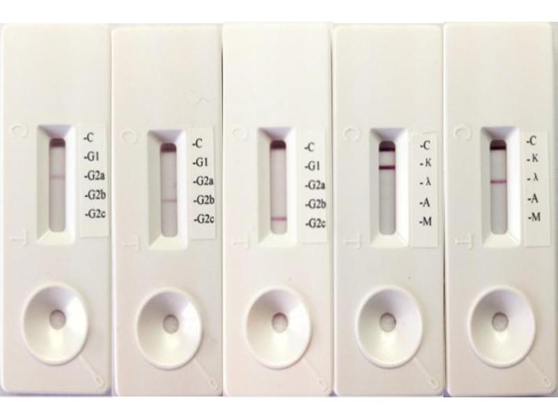 The isotyping kit has three different sizes with 5, 10 or 20 pouches containing two cassettes per pouch: one cassette is for determining IgG1, IgG2a, IgG2b, IgG2c and the other cassette is for determining Kappa, Lambda, IgA and IgM.