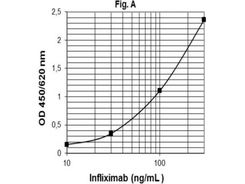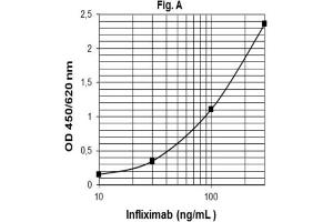 - This is a sandwich type ELISA. Standards and diluted samples (serum or plasma) are incubated in the microtitre plate coated with recombinant human TNF-a (rh TNF-a). After incubation, the wells are washed. A horseradish peroxidase (HRP)-conjugated anti-human IgG monoclonal antibody is added and binds to the Fc part of Infliximab pre-captured by the rh TNF-a on the surface of the wells. Following incubation, the wells are washed and the bound enzymatic activity is detected by addition of chromogen-substrate. The colour developed is proportional to the amount of Infliximab in the sample or standard. Results of samples can be determined directly by using the standard curve.
