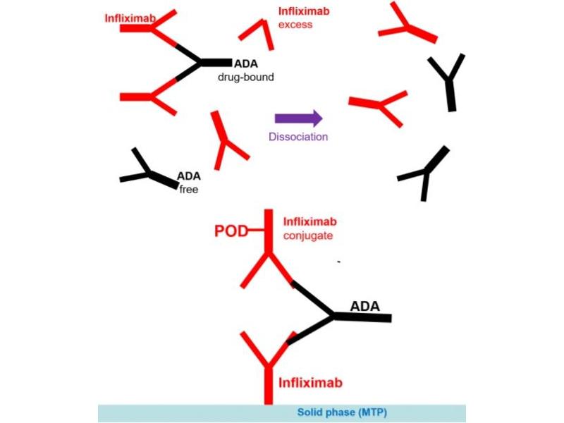 - The Antibody to Infliximab ELISA has been desighed for the determination of total antibodies (free and Infliximab-bound) against Infliximab in serum and plasma samples. During sample preparation, the Infliximab-bound anti-Infliximab antibodies are separated from the complex in order to acquire free anti-Infliximab antibodies. During the incubation period, antibodies to Infliximab (ATI) are replaced and bridged in the well with its Fab arms, between the Infliximab coated on the well and the conjugated Infliximab labelled with peroxidase. After washing away the components the bound enzymatic activity is detected by addition of tetramethylbenzidine (TMB) chromogen-substrate. Finally, the reaction is terminated with stop solution. The positive reaction is related with the presence of ATI in the sample. The semi-quantitative interpretation is made by using the cut-off control.