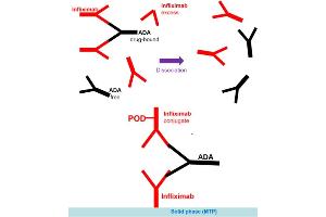 - Infliximab is a chimeric monoclonal antibody and used to treat auto-immune disorders. Infliximab reduces the amount of active human tumour necrosis factor alpha (hTNFα) in the patient by binding to it and preventing it from signaling the receptors for TNFα on the surface of various cell types. TNFα is one of the key cytokines that triggers and sustains the inflammatory reactions. Infliximab is used for the treatment of psoriasis, Crohn's disease, ankylosing spondylitis, psoriatic arthritis, rheumatoid arthritis, ulcerative colitis. This drug is approved by FDA. One of the major concern is the potential development of anti-Infliximab antibodies (ATI) which in turn may interfere with Infliximab efficacy as mainly judged by observing the relapse of signs and symptoms of disease and necessitate dose-escalation or potentially ending up the treatment. In this context, demonstration of anti-Infliximab antibodies during treatment with Infliximab has a major concern and monitoring for the presence of specific antibodies during clinical trials is an important issue for follow up of the treatment regimens. The Total Antibody to Infliximab ELISA Kit can be efficiently used for measuring free and Infliximab-bound antibodies against Infliximab. This test kit can measure any antibodies against Inflixima even in the presence of high excess of Infliximab. But the most convenient time for sampling serum or plasma is the time just before the next administration of the therapeutic antibody. In combination with the drug level determination, the Total Antibody to Infliximab ELISA Kit offers the clinician a tool for monitoring and optimizing the therapy early on. And might be a possible decision on preventive measures to reduce anti-Infliximab antibodies during therapy.