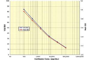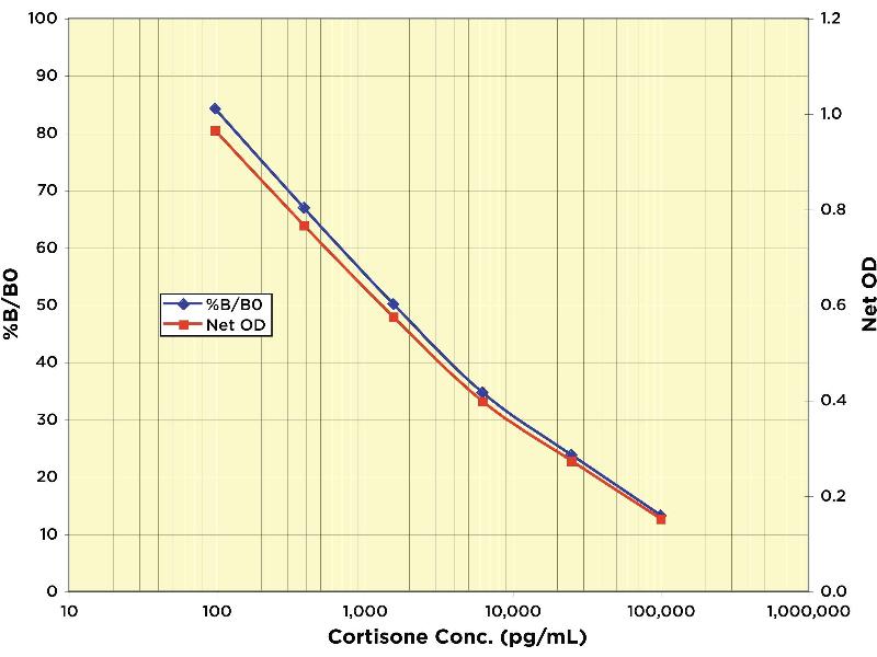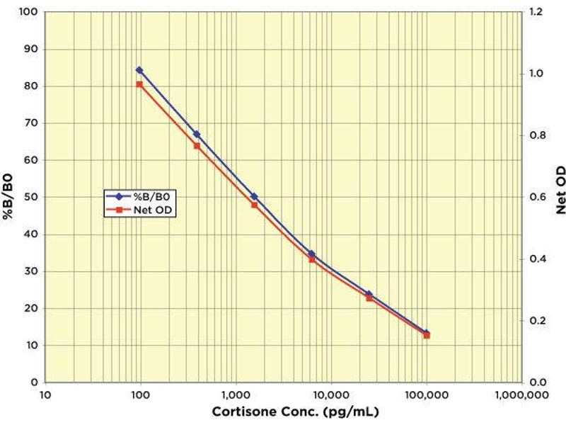 Sample Mean OD Net OD % B/B0 Cortisone Conc. (pg/mL) NSB 0.066 0 - Standard 1 0.243 0.177 14.05 100,000 Standard 2 0.372 0.306 24.299 25,000 Standard 3 0.54 0.474 37.62 6,250 Standard 4 0.746 0.68 53.97 1,562.5 Standard 5 0.966 0.9 71.43 390.6 Standard 6 1.167 1.101 87.38 97.66 B0 1.326 1.26 100 0 Sample 1 0.479 0.413 32.81 9,959 Sample 2 0.677 0.611 49.35 2,095 Always run your own standard curve for calculation of results.