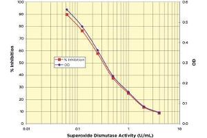 Inhibition values can be obtained by dividing the measured Mean OD for the standard or samples by the Mean OD for the Zero standard (No SOD) and multiplying the result by 100.
