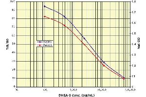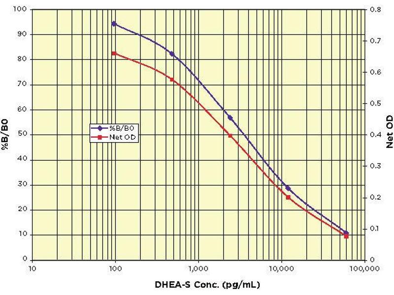 typical data Sample Mean OD Net OD % B/B0 Dehydroepiandrosterone sulfate (DHEA-S) Conc. (pg/mL) NSB 0.065 0 - - Standard 1 0.141 0.076 10.9 60,000 Standard 2 0.266 0.201 28.7 12,000 Standard 3 0.463 0.398 56.9 2,400 Standard 4 0.641 0.576 82.3 480 Standard 5 0.725 0.660 94.3 96 B0 0.765 0.700 100 0 Sample 1 0.308 0.243 34.7 8,208 Sample 2 0.413 0.348 49.6 3,580 Always run your own standard curve for calculation of results.